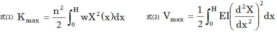 梁の振動理論に基づけば、梁の最大運動エネルギーおよび最大曲げエネルギーはそれぞれ式(1)、式(2)で表され、両者は等しくなります。